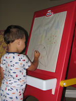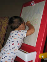 an easel from Grandma Pam. He loves to color and draw on it, and Mom and Dad