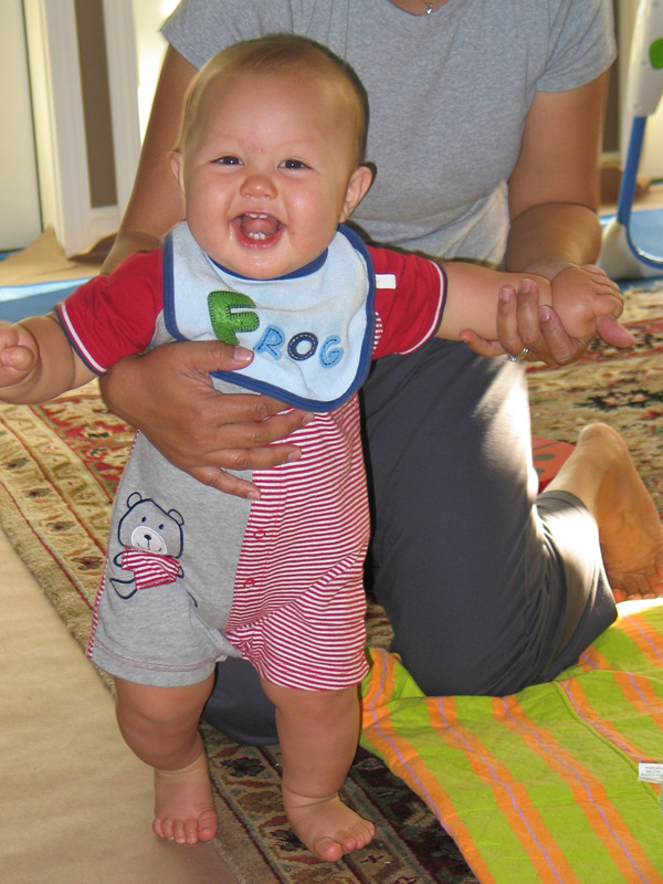 Our baby is getting really close to walking on his own. Sometimes he likes to run and take big steps on this tippy toes. |