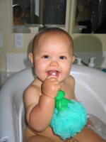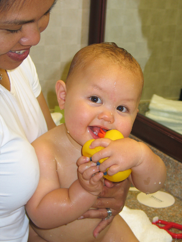 On a weekend getaway w/ Mom, Dad & Grandma, Jordan enjoys bath-time w/ Rubber Ducky in the Westin hotel's Heavenly Bath. |