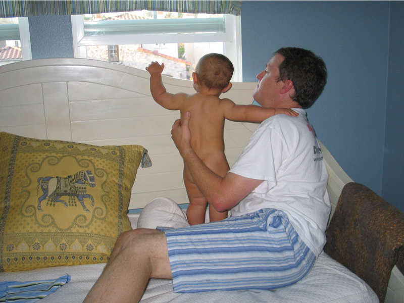 Jordan stands on a pillow to look out the window in his room just before bath time. |