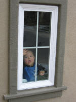 Jordan likes to stand in front of the small window in Grandma's closet, watch the neighbor boys play outside and licks the window clean. Mommy took this photo from the balcony across the way. |